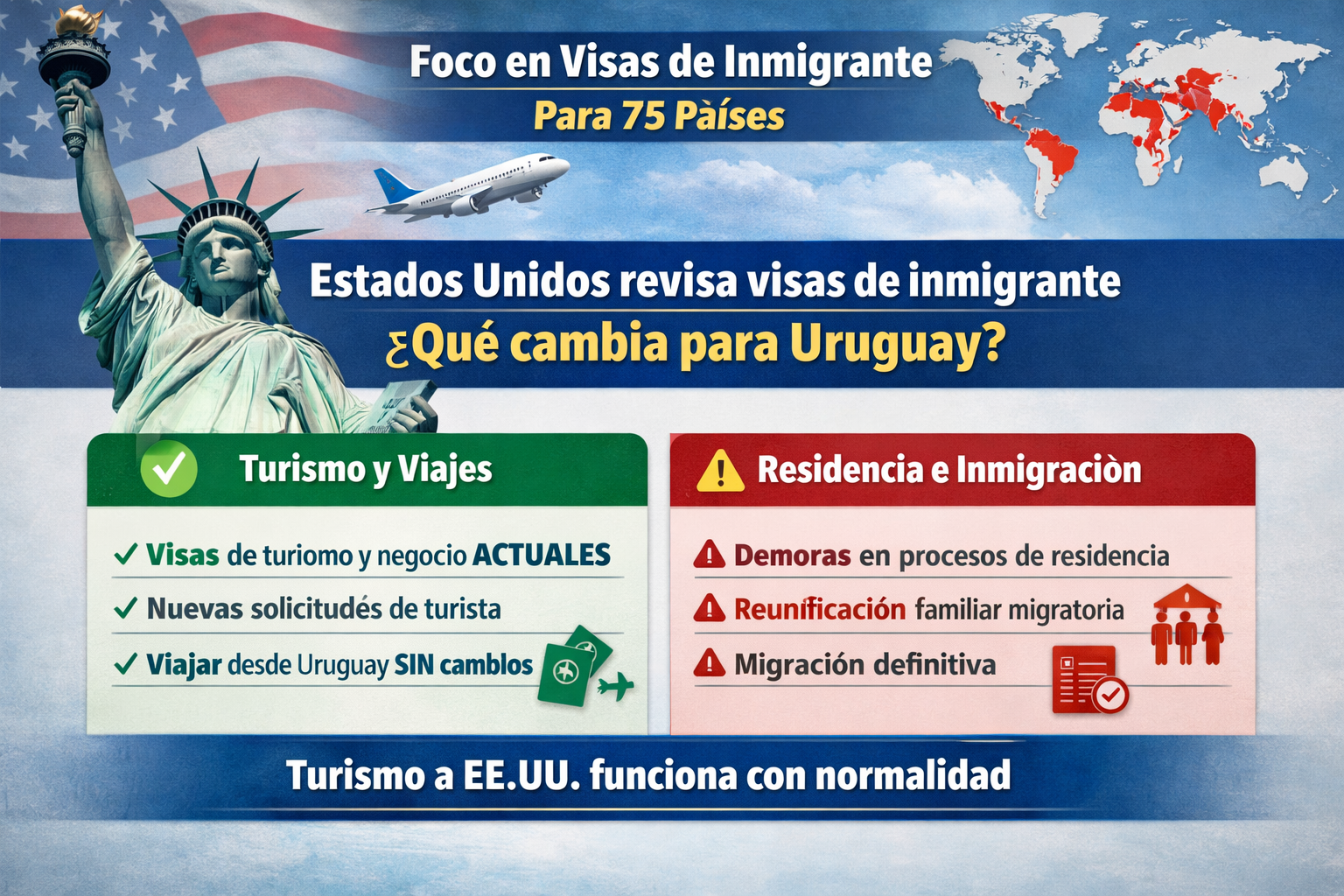 De acuerdo con información divulgada por la prensa norteamericana, el gobierno estadounidense dispuso una pausa temporal en el procesamiento de visas de inmigrante —aquellas vinculadas a procesos de residencia permanente— para ciudadanos de 75 países, entre ellos Uruguay y Brasil.