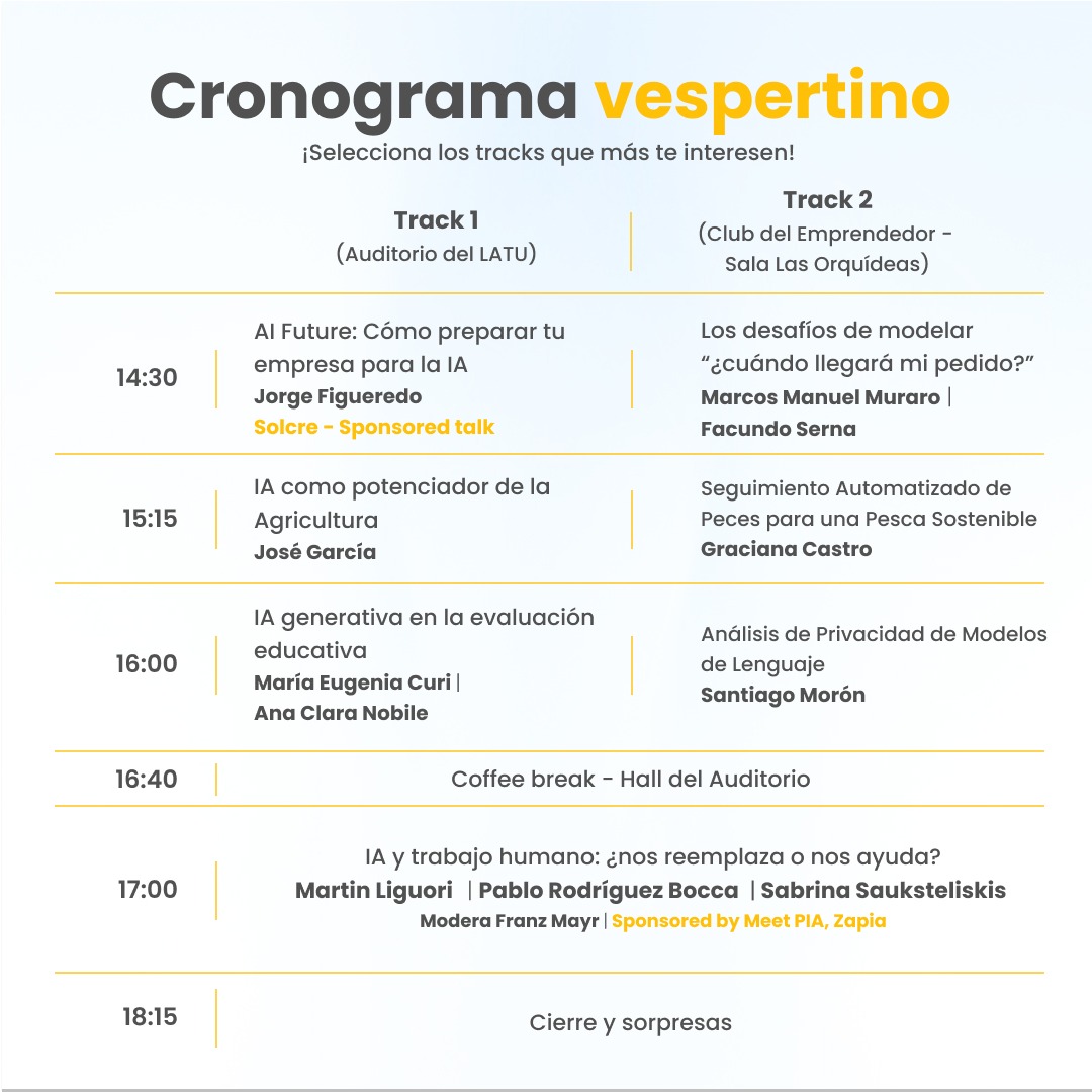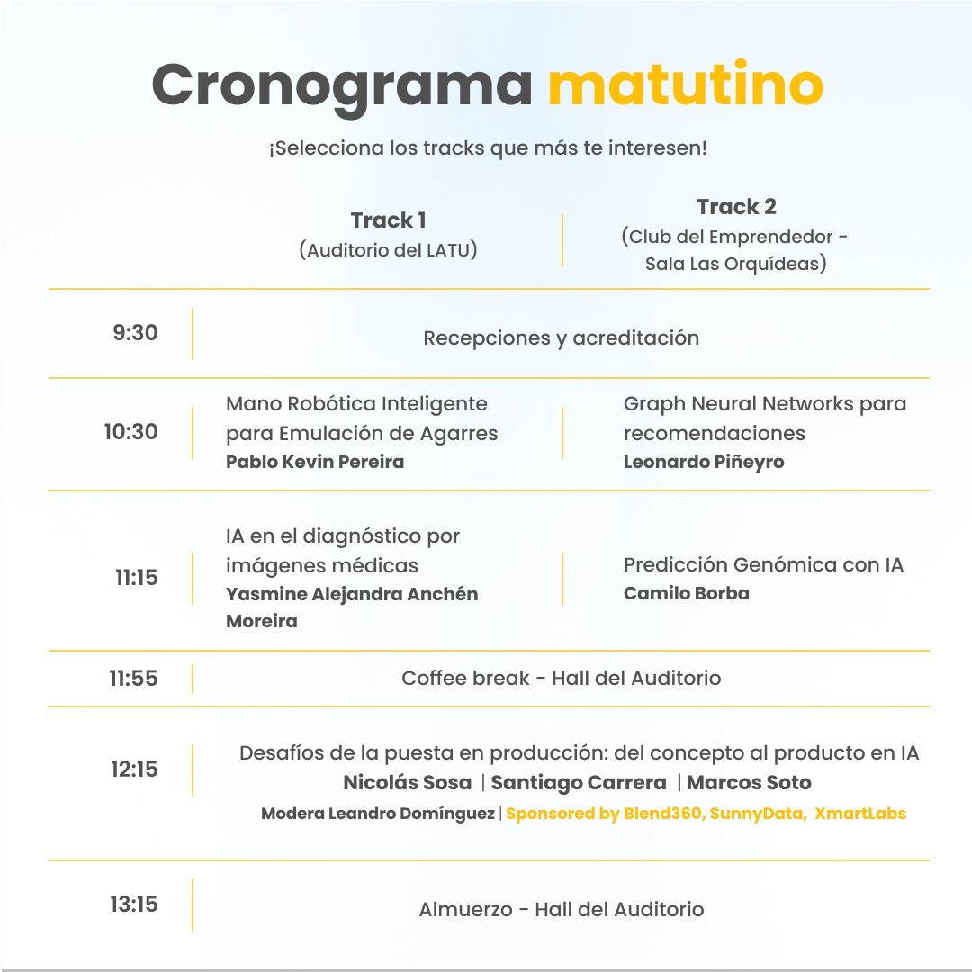 Entre los ejes más destacados se encuentran los casos prácticos de empresas uruguayas que lograron incorporar IA a su operativa, generando mejoras en eficiencia, predicción y servicio al cliente. También se presentarán nuevas herramientas y frameworks, como redes neuronales aplicadas a recomendaciones, IA generativa para evaluación educativa y análisis de privacidad en modelos de lenguaje.